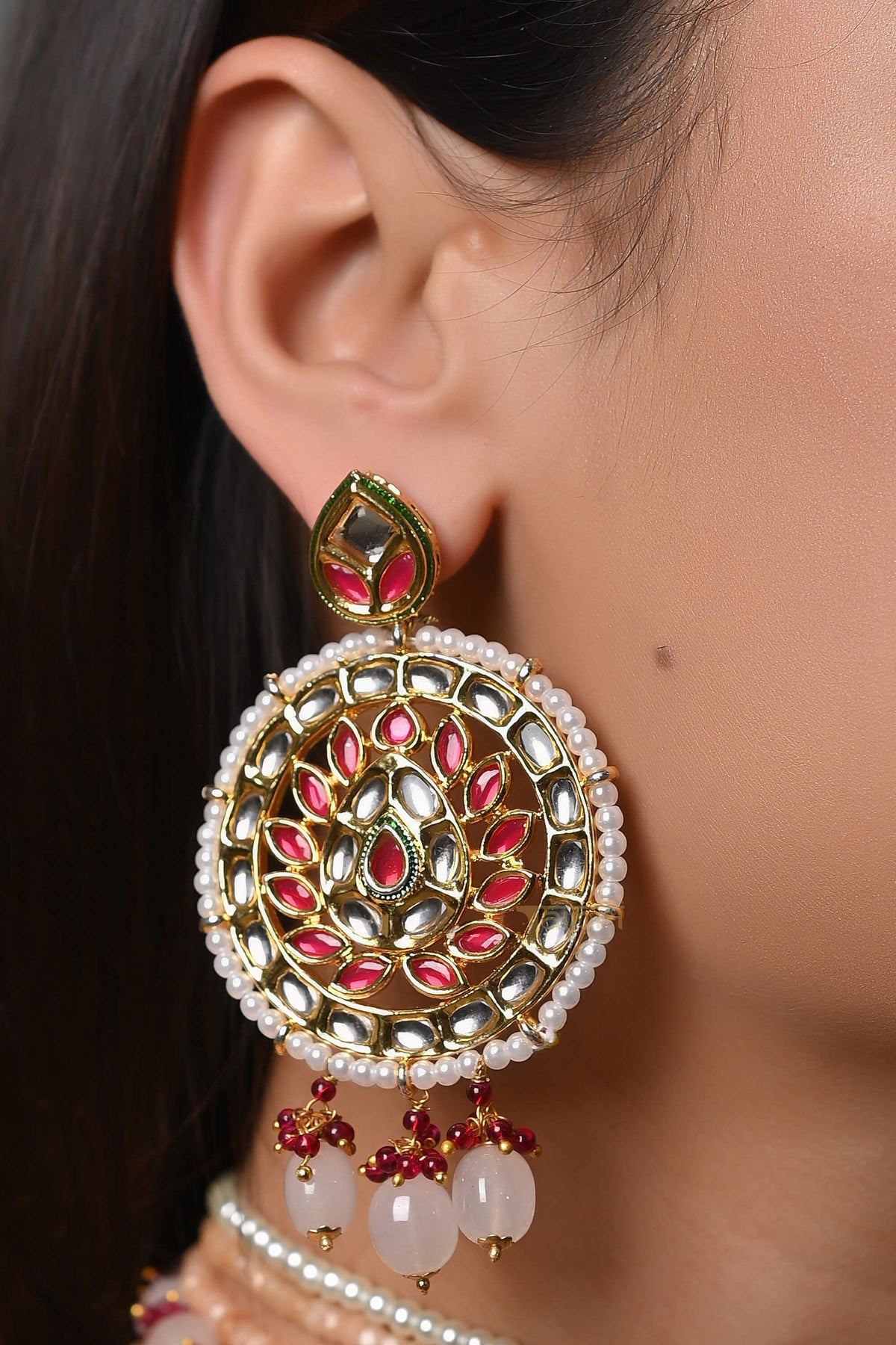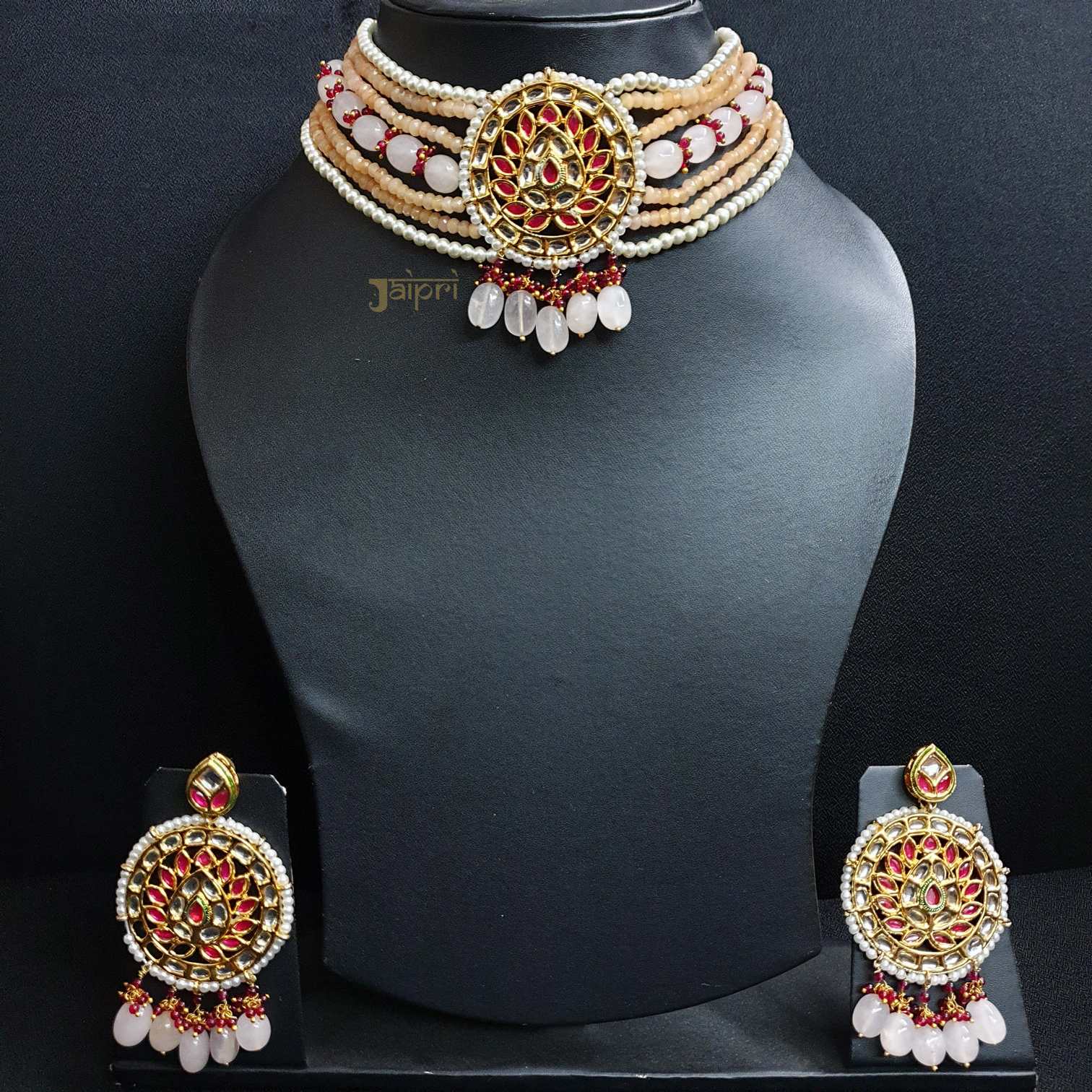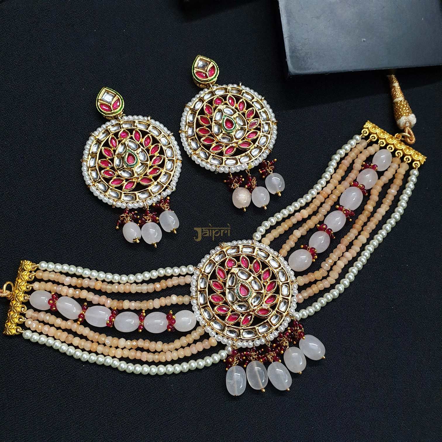 Peach Pink Stone Kundan Choker Necklace With Earrings