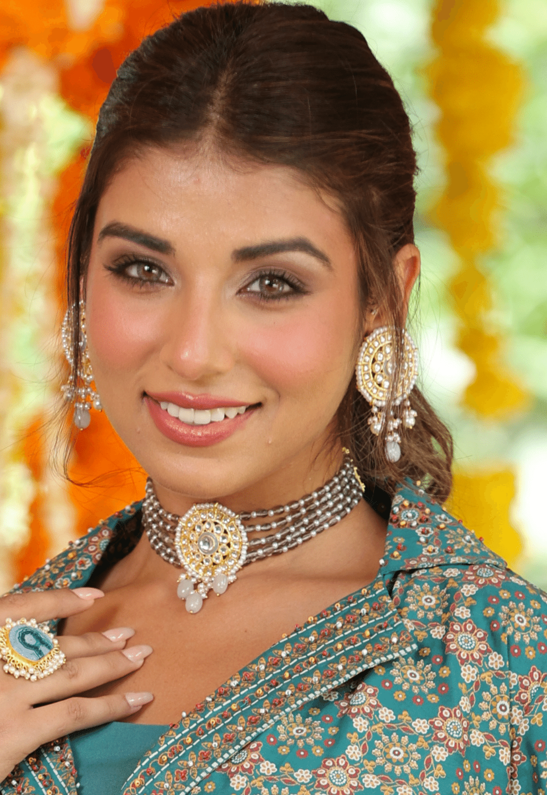 Exquisite and modern, this kundan beaded choker with earrings is designed for those who desire sophistication. Crafted with luxurious, handmade details, this timeless piece is perfect for making bold statements. Incorporating classic kundan and beading details, it adds a touch of elegance to any look.