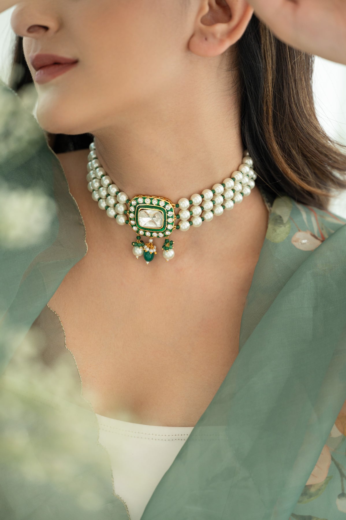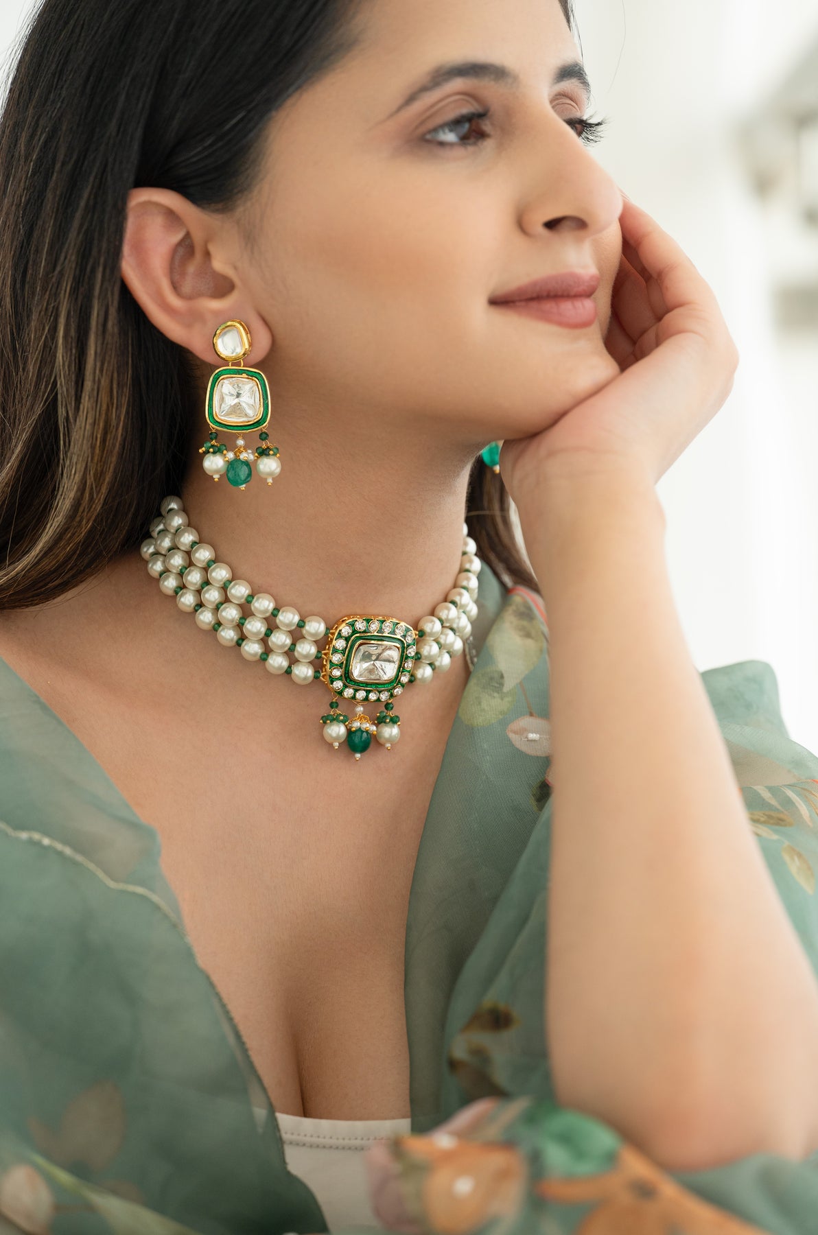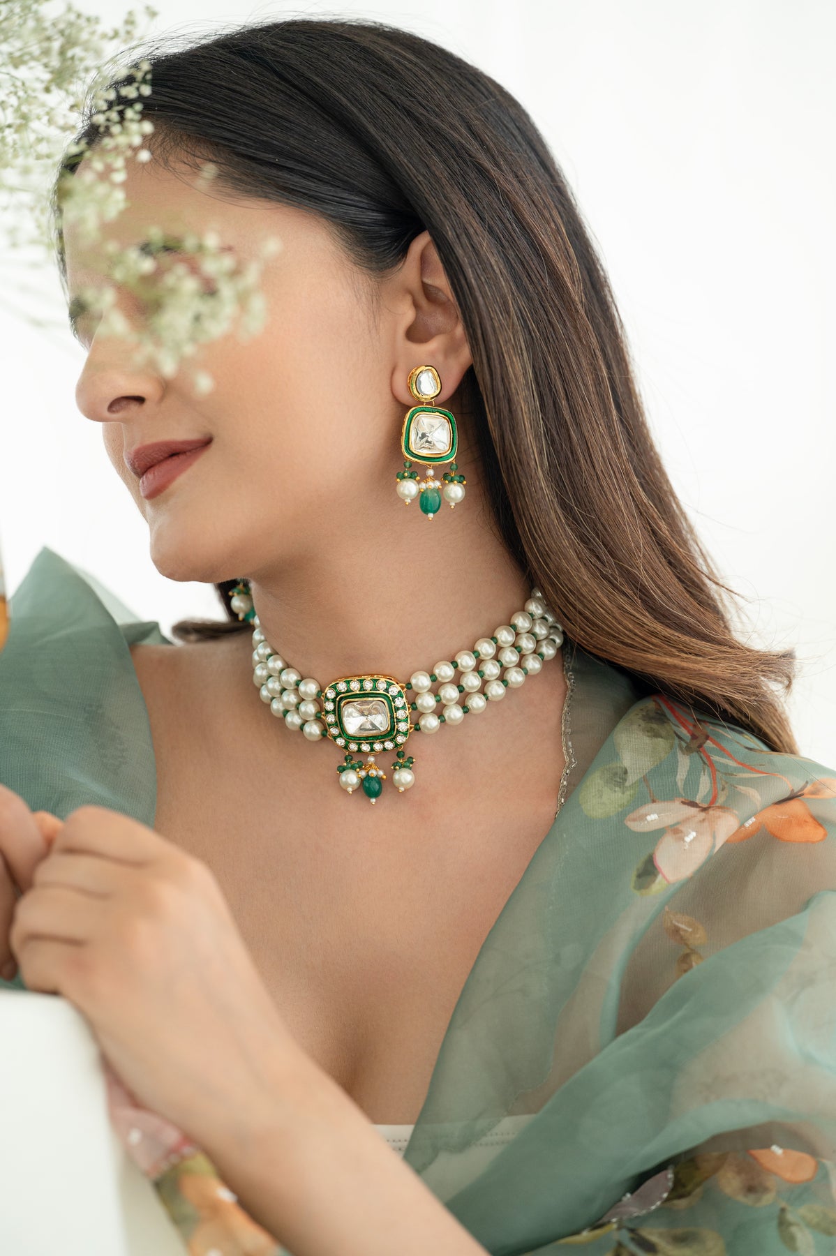 An elegant Kundan meenakari pearl choker necklace & earrings with the most stunning festoon. The perfect accessory for your occasion. This necklace set is handcrafted with love