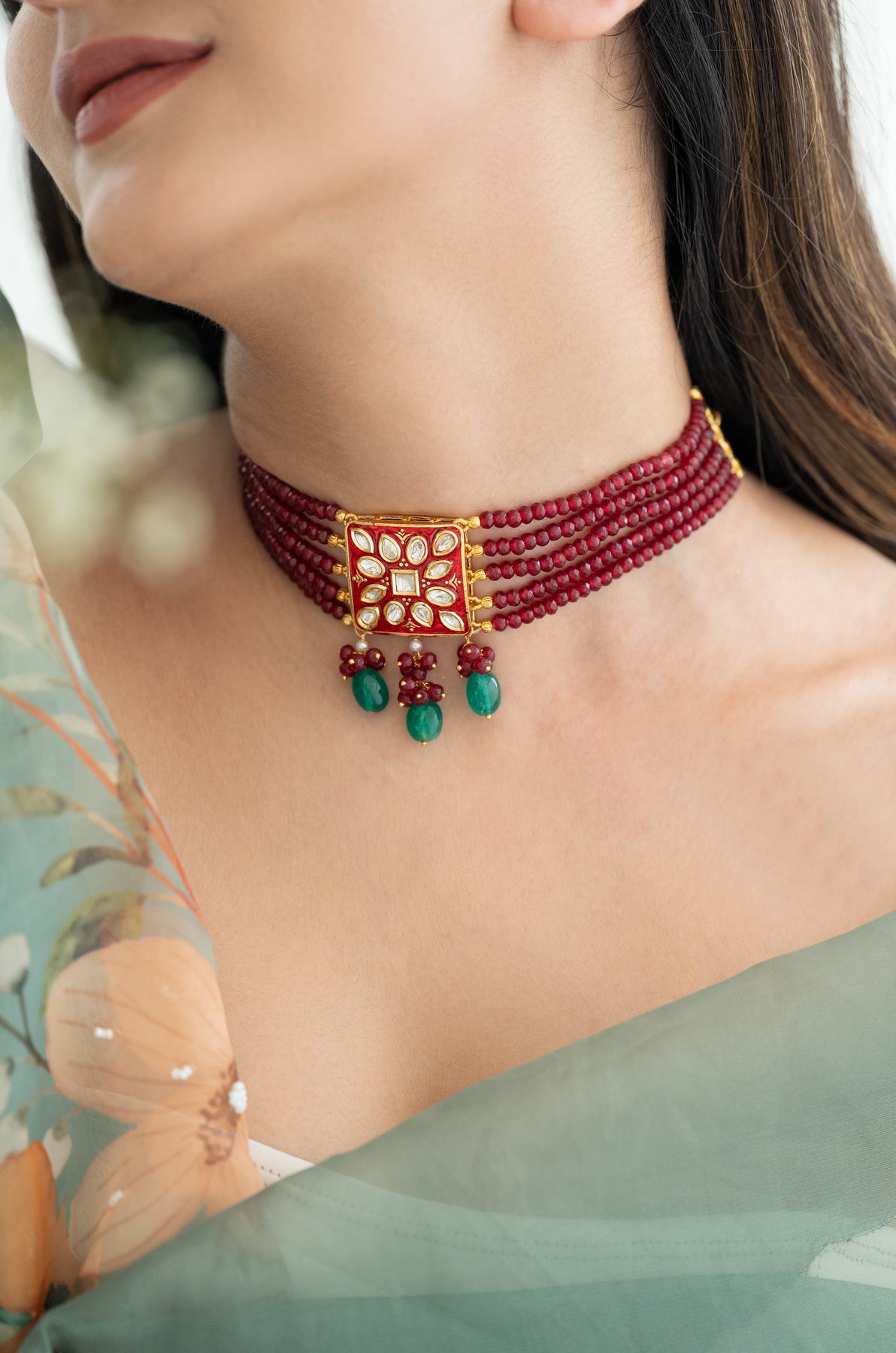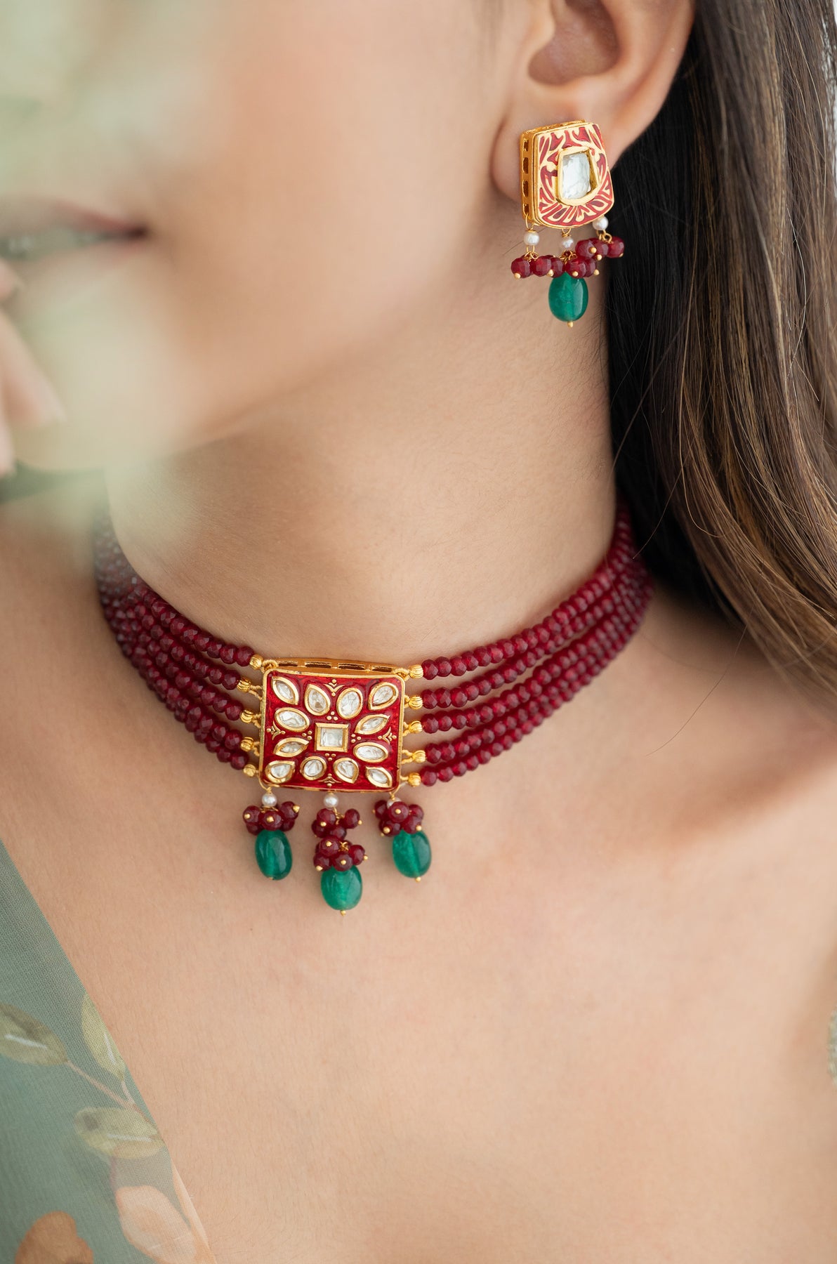An elegant green meenakari ruby red stone choker Kundan necklace & earrings with the most stunning festoon. The perfect accessory for your occasion. This necklace set is handcrafted with love