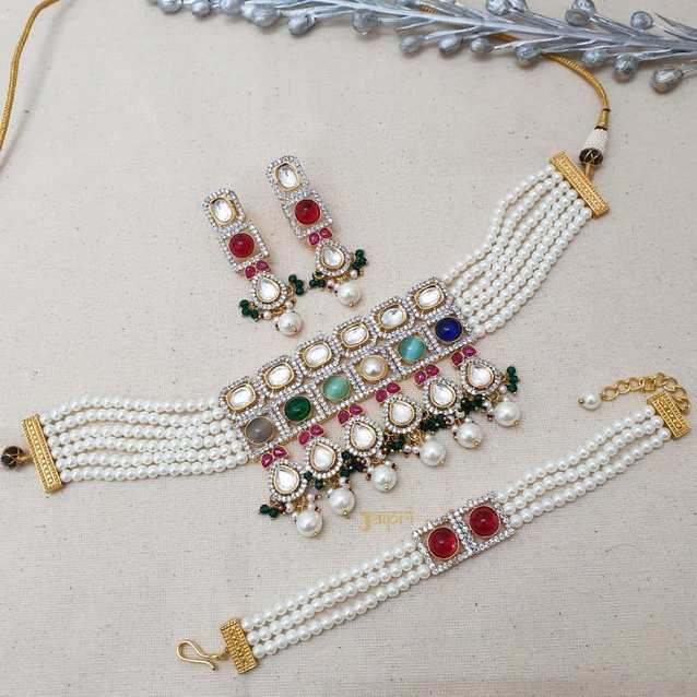 Multicolor Stone Pearl Choker Necklace and Earrings With Bracelet